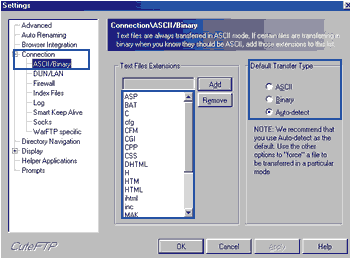 2. Binary : for files that can't read by notepad such as all picture (gif, jpg, png), flash file (swf), MP3, Video, MPEG etc. Then choose Default Transfer Type -> Auto-detect. The program will select transfer while you downloading or uploading. So, you must set Text Files Extensions which surname in list will be transfer by ASCII. And others will transfer automatically by Binary. Then check file list is exactly, if not, you can click add and insert surname of file.
