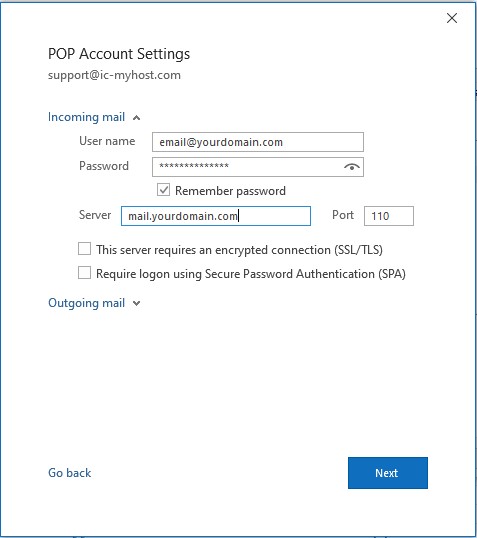 8. Outgoing mail at Server change to your info such as mail.yourdomain.com and the most important thing don't forget to press / infront of My outgoing (SMTP) server requires authentication and select Use same settings as my incoming mail server as picture, then press Repair