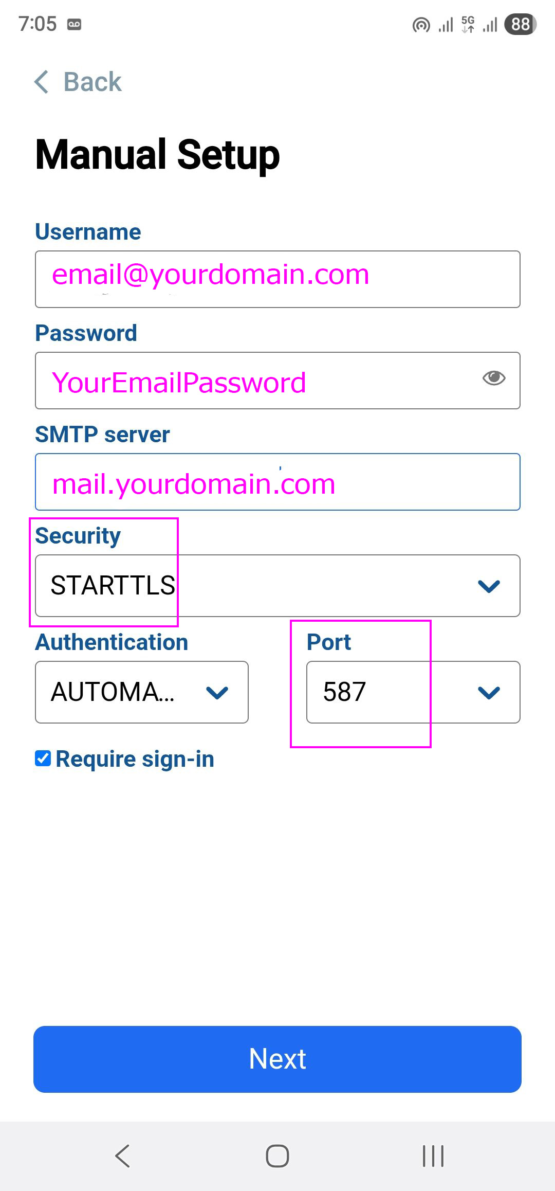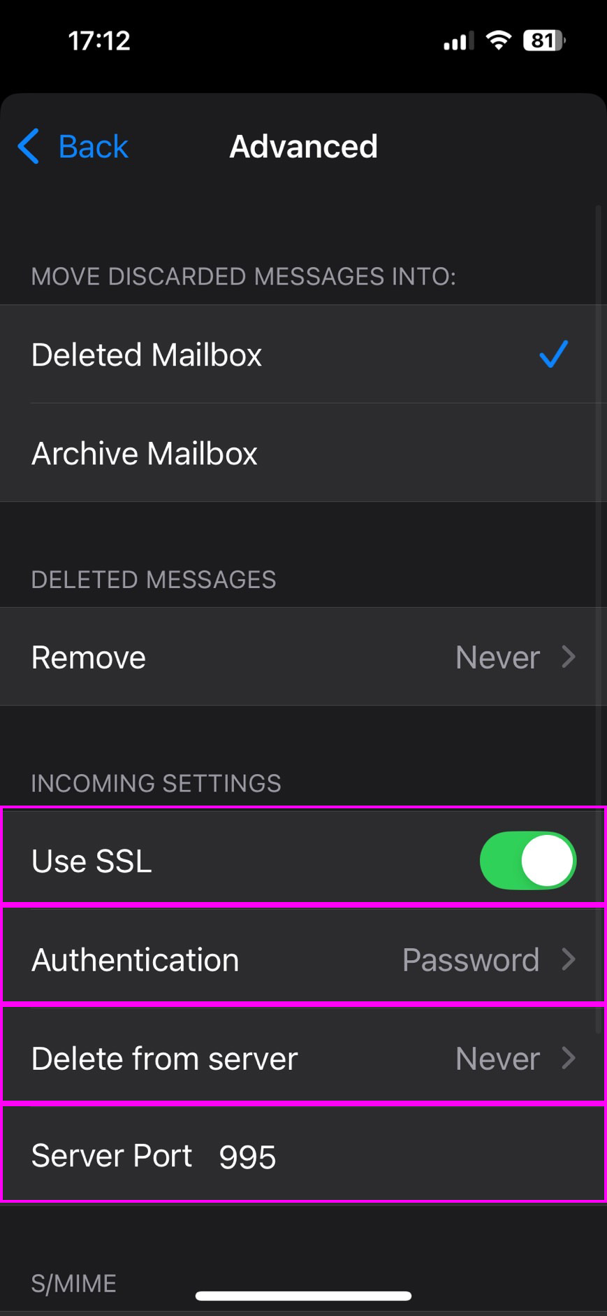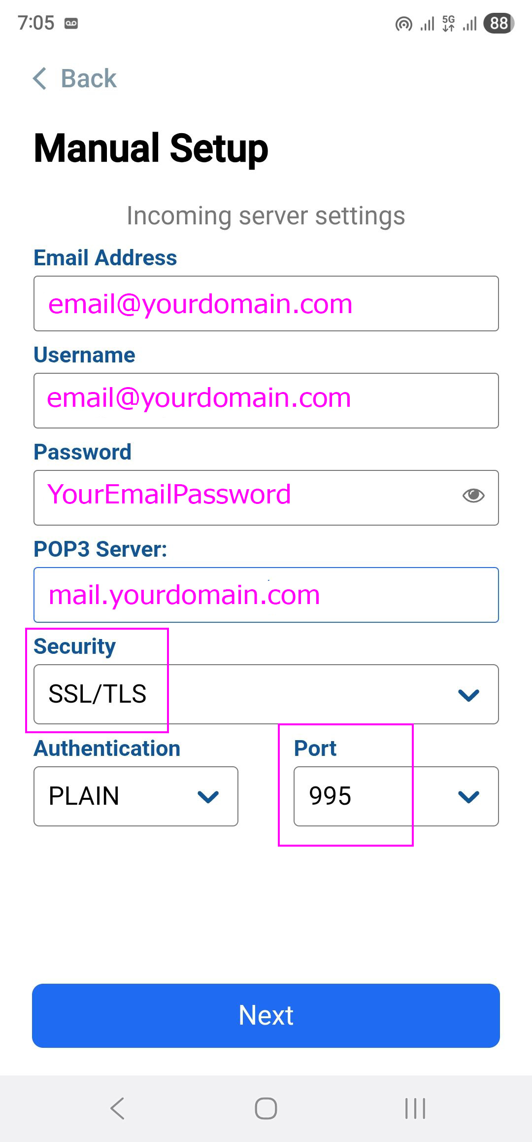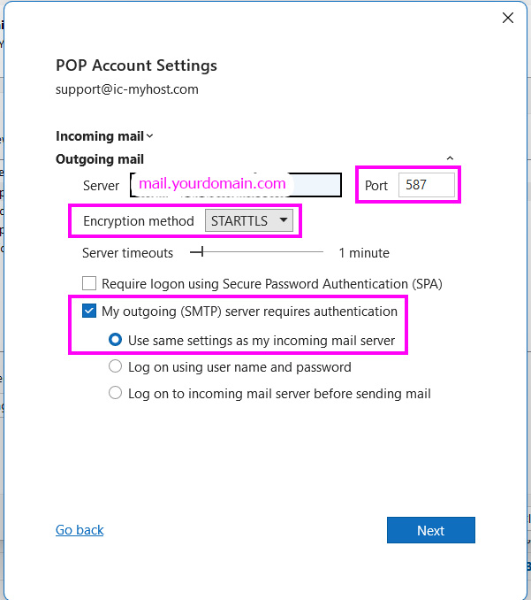 IN : / SSL/TLS :: 995 OUT : STARTTLS :: 587 / my authen same incoming