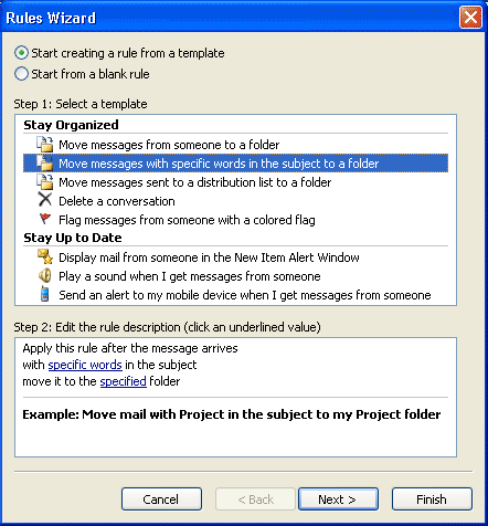 3. Click New Rule > Rules Wizard > Step 1 : Select a template > click "Move messages with specific words in the subject to folder" > Next