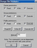 ให้เลือก mode ตามที่เราต้องการ ถ้าเป็น CGI/perl โดยปกติ จะต้องเปลี่ยน เป็น 755 การ chmod นั้น จะเป็นการกำหนดสิทธิในการจัดการกับไฟล์ที่ได้รับการ chmodว่าจะสามารถทำอะไรได้บ้าง Read (อ่าน) Write(เขียน) Execute(ประมวลผลได้) โดยสามารถแบ่งออกเป็น 3 กลุ่มคือ