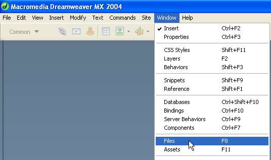 หากต้องการสร้าง แก้ไข เว็บเพจ ผ่านโปรแกรม Macromedia Dreamweaver MX 2004 พร้อมทั้งให้โปรแกรมนี้ทำการ upload เลยทันที สะดวกมาก มาลองใช้กันดูนะคะ ก่อนอื่นต้องเปิด menu Files ขึ้นมาก่อน ไปที่ Window -> Files ดังรูป