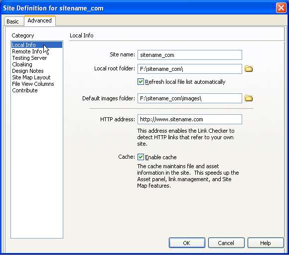 ก่อนอื่นเราต้องทำการ set local Info เสียก่อน ตั้งชื่อ Site name, ตั้ง ที่อยู่ของ local root folder, default images folder (ของ local) และ address ของเว็บเรา