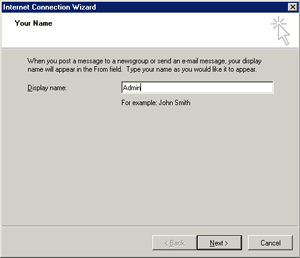 หลังจากคลิ๊กปุ่ม Add->Mail แล้วจะมี่หน้าต่างตามรูปด้านล่างปรากฏขั้น ให้ทำการใส่ชื่อ user ในช่อง Display name ชื่อที่ใส่จะปรากฏในช่อง FROMของผู้ที่รับอีเมล์ของเรา เสร็จแล้วคลิ๊ก Next
