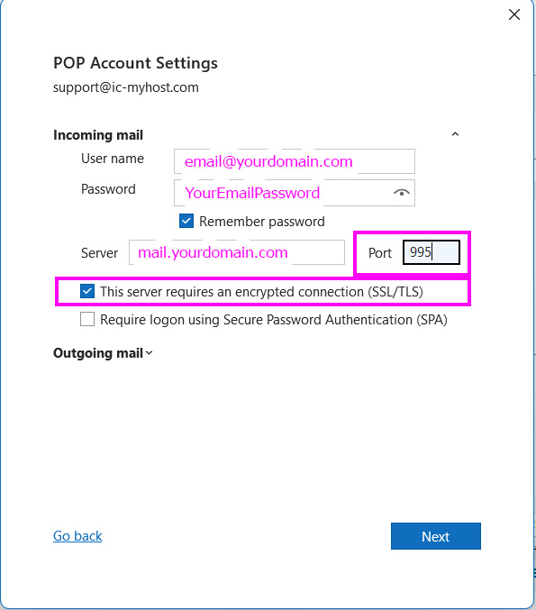 IN : / SSL/TLS :: 995 OUT : STARTTLS :: 587 / my authen same incoming
