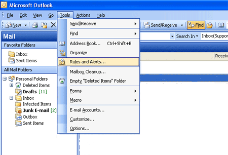 1. เราจะทำการจัดการตัว SPAM Email บน Outlook โดยเข้าที่เมนู Tools แล้วเลือกที่เมนู Rules and Alerts... ตามรูป