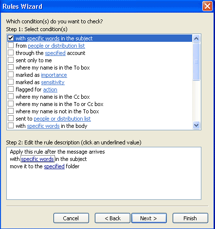 4.เมื่อทำการกดปุ่ม Next แล้วจะเปลี่ยนหน้าใหม่เป็นดังรูป ในหัวข้อ Step 2 : Edit the rule descriptionให้ทำการคลิ๊กที่ "with specific words in the subject" เพื่อทำการให้ข้อความที่เราจะต้องการกรอง จะปรากฏหน้าต่างตามรูป