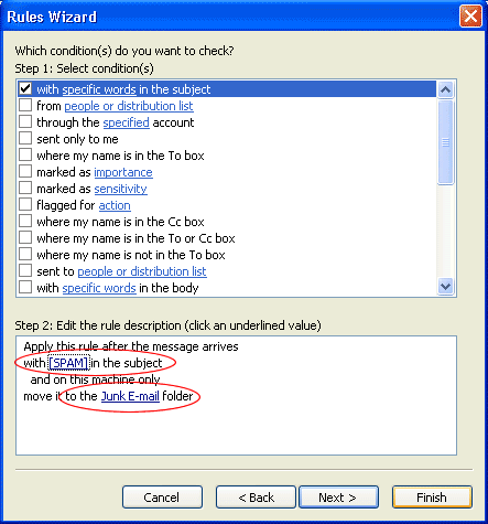 ใน Step 2 : Edit the rule descriptionเราทำการจัดการคลิ๊กที่ specific words แล้วต่อมาให้เรา ทำการคลิ๊กที่ "move it to the specific folder" เพื่อทำการเลือก folder ที่เราต้องการให้ email spam เข้าที่ folder Junk E-mail ดังรูป