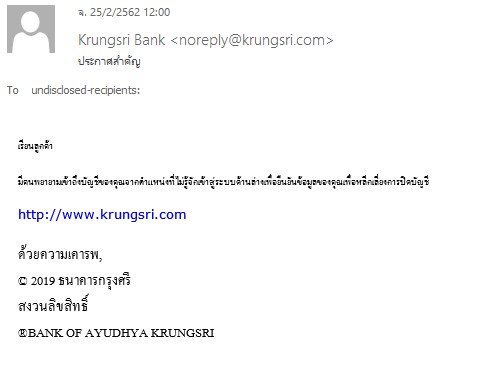 และให้ลองเอา mouse ไปวางเบาๆ บน่ลิงค์ที่มี ว่ามีการทำลิงค์ไปยังคนละที่หรือไม่ ถ้ามีการลิงค์ไปกันคนที่ละ ฟันธงได้เลยค่ะว่า เป็น Emaill หลอกลวงค่ะ ดังตัวอย่างนี้ ในเนื้อความ เชียนว่า http://www.krungsri.com แต่แท้จริงแล้ว เวลาคนใช้งานกด แล้วจะส่งลิงค์ไปยัง https://etrack.co.in/krunggsr/krungsriburuji/index.html เป็นต้น และ สุดท้าย หากตรวจสอบทุกๆ อย่างแล้ว ยังไม่แน่ใจว่า เป็น Email หลอกลวงหรือไม่ ก็อย่ากดค่ะ ให้ติดต่อไปยังหน่วยงานที่เกี่ยวข้อง เพื่อสอบถามเจ้าหน้าที่ สิ่งเหล่านี้ จะทำให้เราไม่ผิดพลาดต่อนิติกรรมต่างๆ ค่ะ