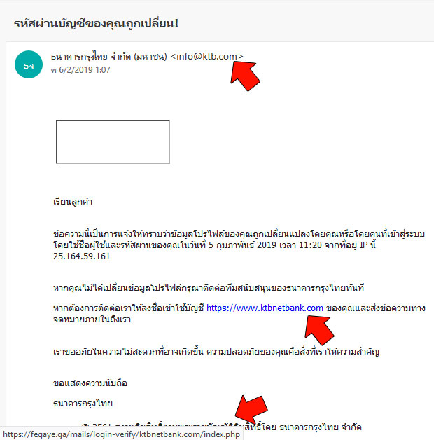 และให้ลองเอา mouse ไปวางเบาๆ บน่ลิงค์ที่มี ว่ามีการทำลิงค์ไปยังคนละที่หรือไม่ ถ้ามีการลิงค์ไปกันคนที่ละ ฟันธงได้เลยค่ะว่า เป็น Emaill หลอกลวงค่ะ ดังตัวอย่างนี้ ในเนื้อความ เชียนว่า https://www.ktbnetbank.com แต่แท้จริงแล้ว เวลาคนใช้งานกด แล้วจะส่งลิงค์ไปยัง https://fegaye.ga/mails/login-verify/ktbnetbank.com/index.php เป็นต้น และ สุดท้าย หากตรวจสอบทุกๆ อย่างแล้ว ยังไม่แน่ใจว่า เป็น Email หลอกลวงหรือไม่ ก็อย่ากดค่ะ ให้ติดต่อไปยังหน่วยงานที่เกี่ยวข้อง เพื่อสอบถามเจ้าหน้าที่ สิ่งเหล่านี้ จะทำให้เราไม่ผิดพลาดต่อนิติกรรมต่างๆ ค่ะ